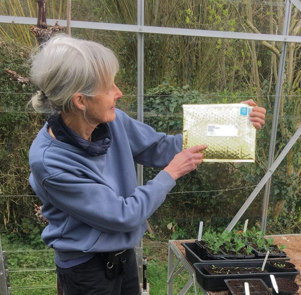 Last month Wales Seed Hub received a very special packet of seeds from the Heritage Seed Library’s 50th Anniversary ‘Seed Relay’. This is part of a campaign and series of of engagement activities aimed at raising awareness about the Heritage Seed Library, and highlighting the importance of saving and sharing seed. The seeds we have been given are ‘Golden Gazzi’ Tomato – which we have now sown – and they came in a very fancy golden parcel (pictured above with our member Sue!) with address labels and instructions to post it on to the next person. For more information about the campaign and to get involved yourself head over to the Heritage Seed Library’s webpage here.