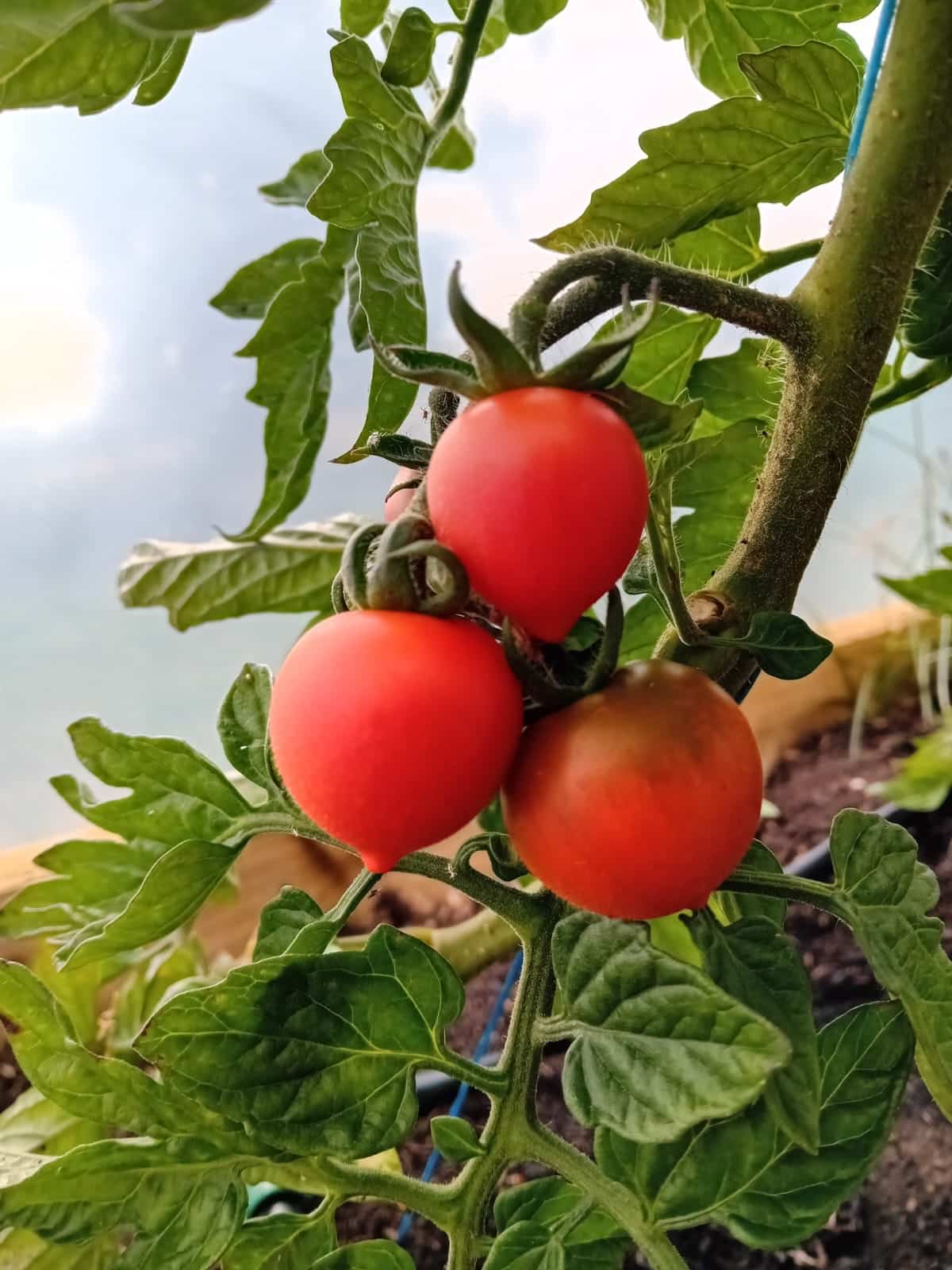 Vine / Indeterminate tomatoes grow tall (over 8ft if you let them) and skinny, so will need strong supports – either a very tall stake, or string. We attach ours to an overhead line with string, and wind it round the plant as it grows. They will require their side shoots ‘pinching out’ regularly throughout the season, concentrating the growth within the central, fruit producing stem, and you can also pinch out the top if they get too tall, which will also result in the fruit ripening quicker. Fruit trusses are generally long, and the tomatoes will ripen slowly over the season, resulting in a long cropping period and a heavier crop for the amount of space the plant takes up.